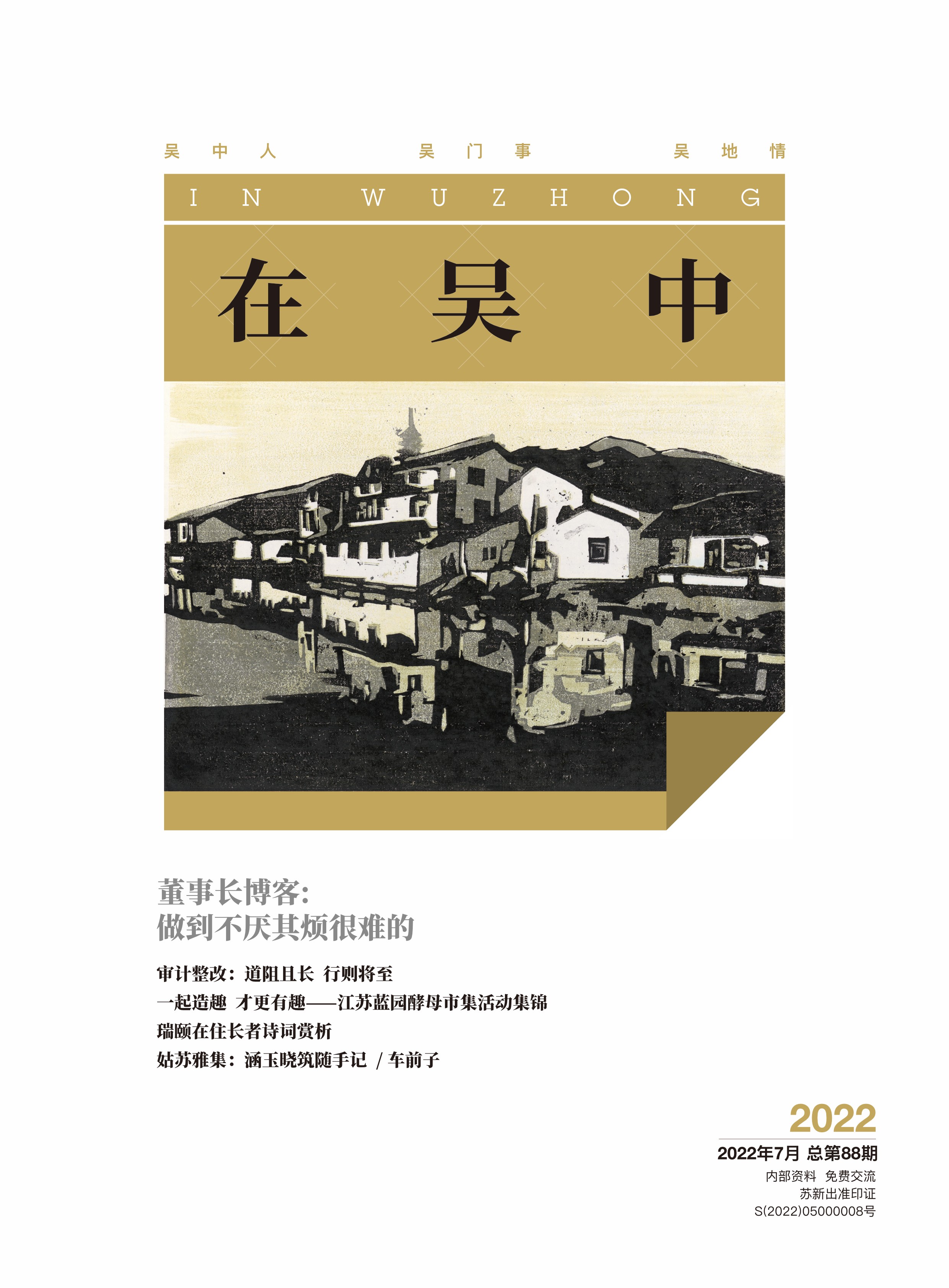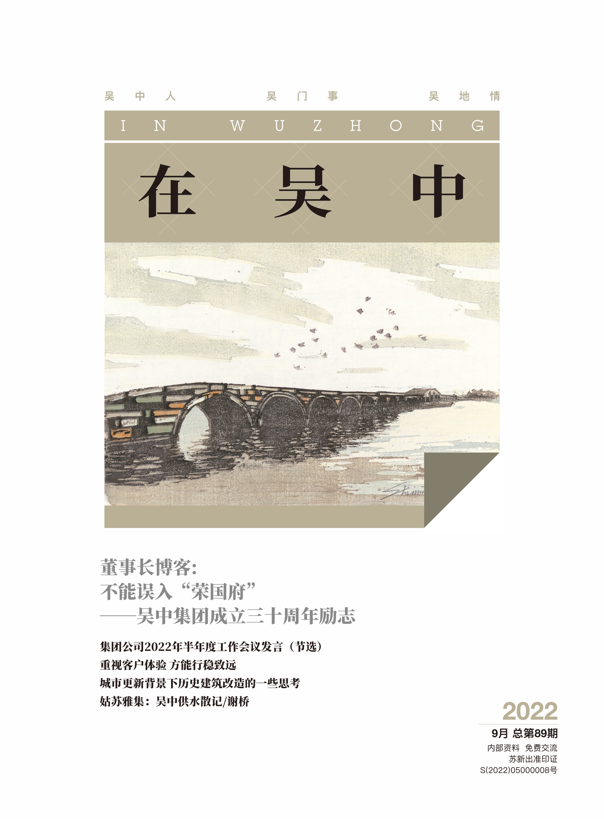 《在吳中》創(chuàng)刊于2005年,蘇州市十佳內(nèi)刊。以述吳中人、記吳中事、傳吳中情為宗旨,堅(jiān)持記錄吳中集團(tuán)的發(fā)展,為品牌建設(shè)發(fā)展助力。《在吳中》單期印刷1500冊,主要用以企業(yè)內(nèi)部交流,其意在傳達(dá)的吳中集團(tuán)的力量、文化和精神。每期《在吳中》都記載著吳中人工作、學(xué)習(xí)、生活的實(shí)時(shí)動態(tài),所見所聞、所思所想、所作所為,總結(jié)借鑒企業(yè)經(jīng)營管理之道,汲取吳地人文精髓,廣受社會各界的好評和認(rèn)可。
