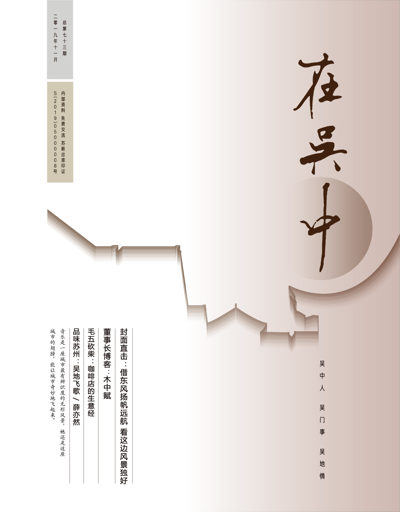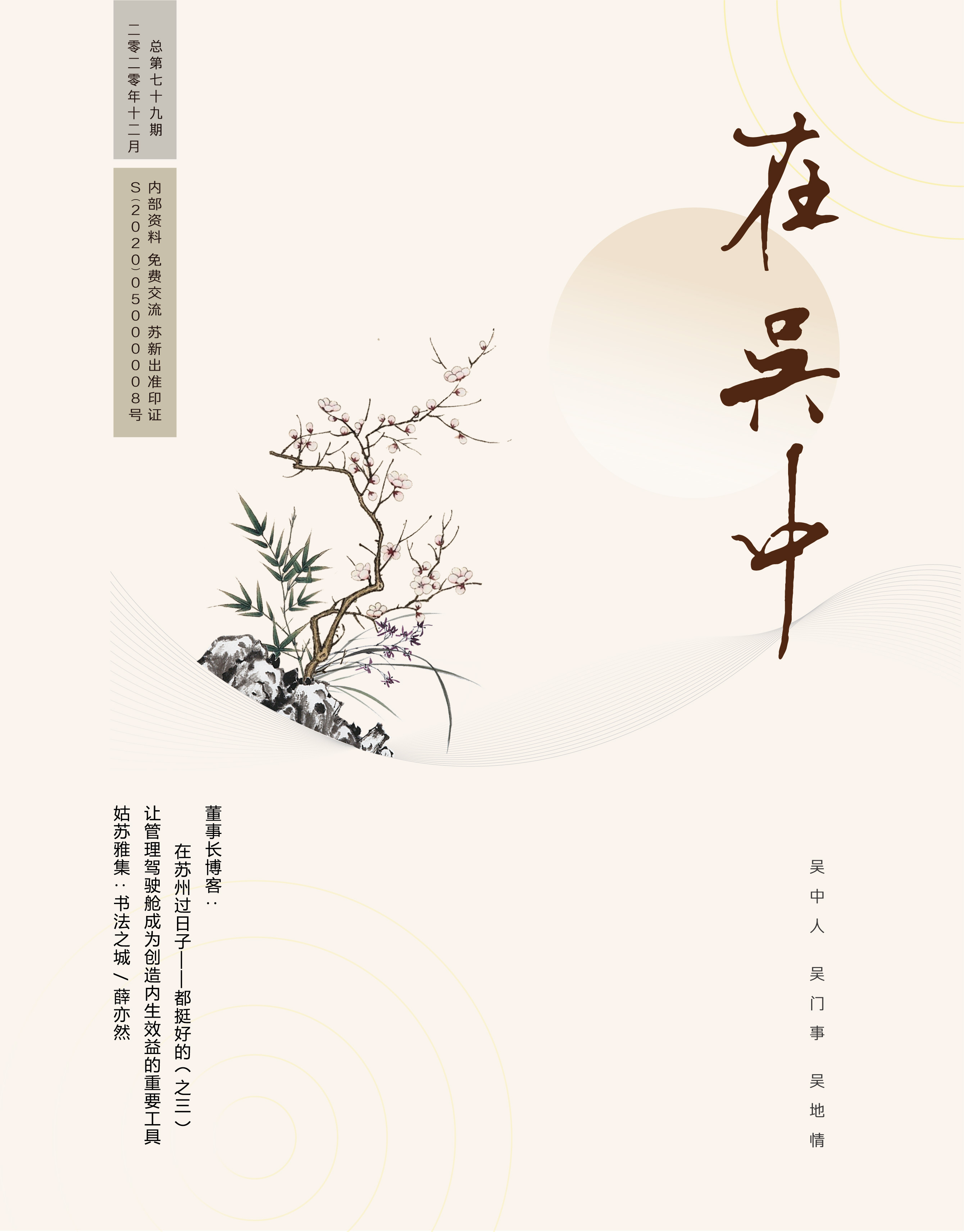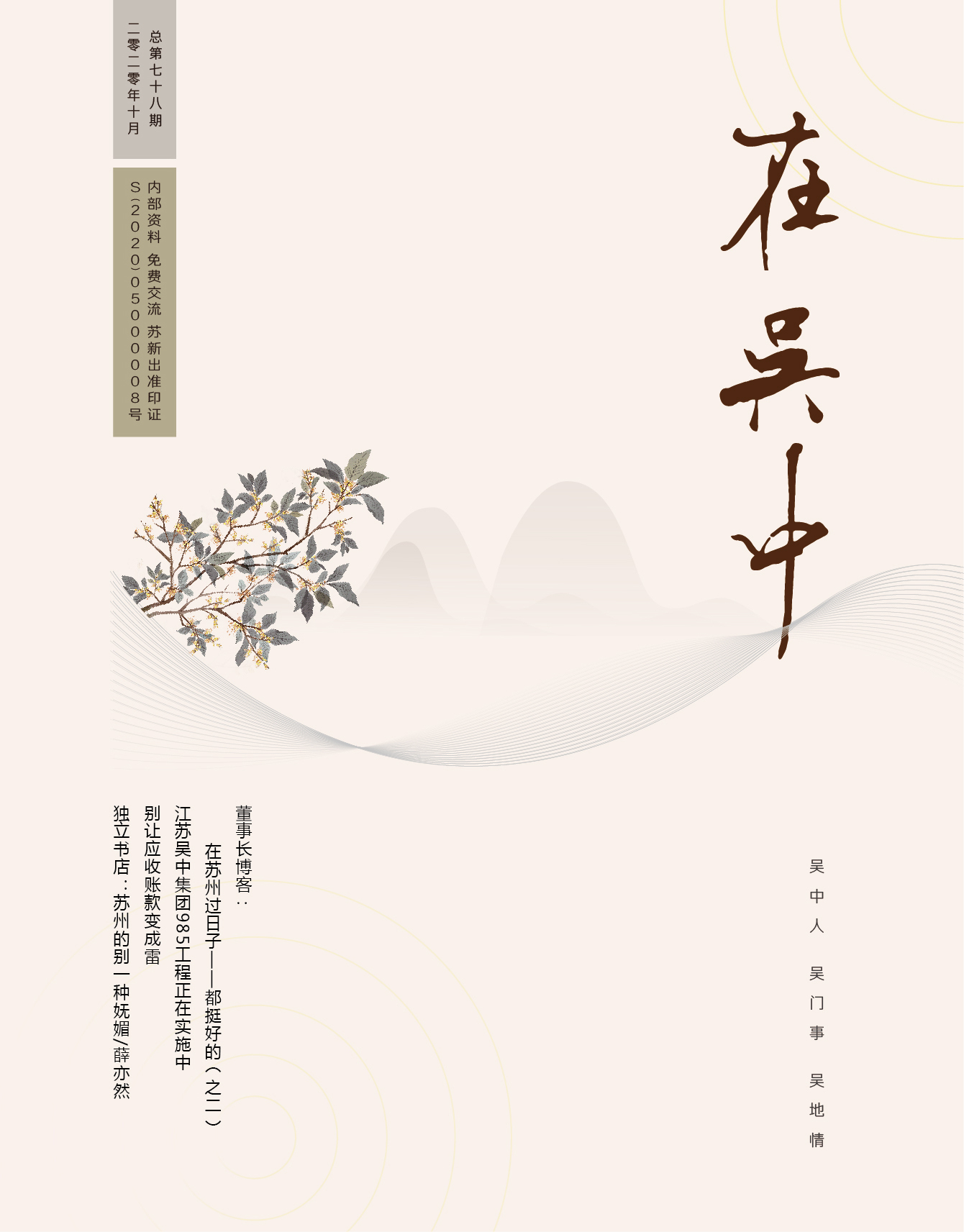 《在吳中》創(chuàng)刊于2005年,蘇州市十佳內(nèi)刊。以述吳中人、記吳中事、傳吳中情為宗旨,堅(jiān)持記錄吳中集團(tuán)的發(fā)展,為品牌建設(shè)發(fā)展助力?!对趨侵小穯纹谟∷?500冊(cè),主要用以企業(yè)內(nèi)部交流,其意在傳達(dá)的吳中集團(tuán)的力量、文化和精神。每期《在吳中》都記載著吳中人工作、學(xué)習(xí)、生活的實(shí)時(shí)動(dòng)態(tài),所見所聞、所思所想、所作所為,總結(jié)借鑒企業(yè)經(jīng)營管理之道,汲取吳地人文精髓,廣受社會(huì)各界的好評(píng)和認(rèn)可。