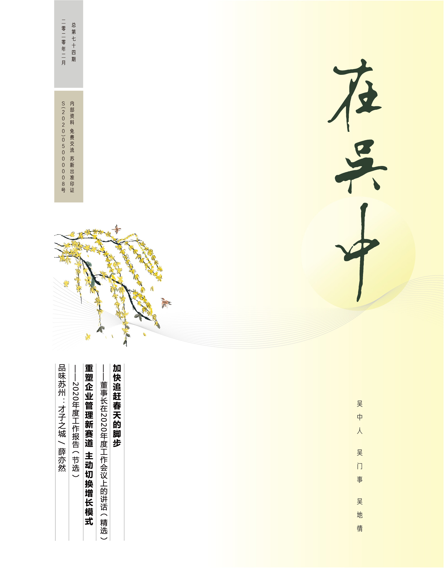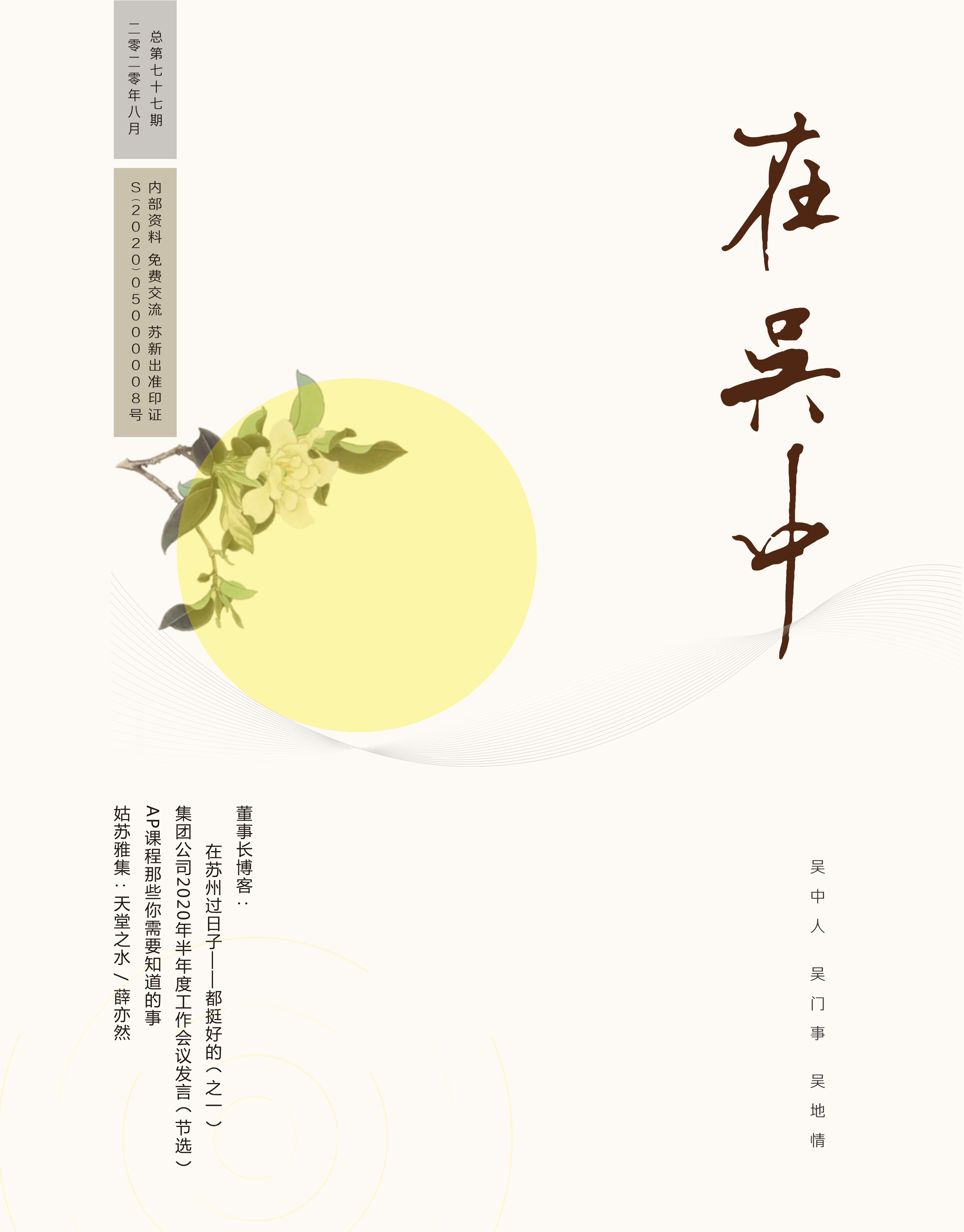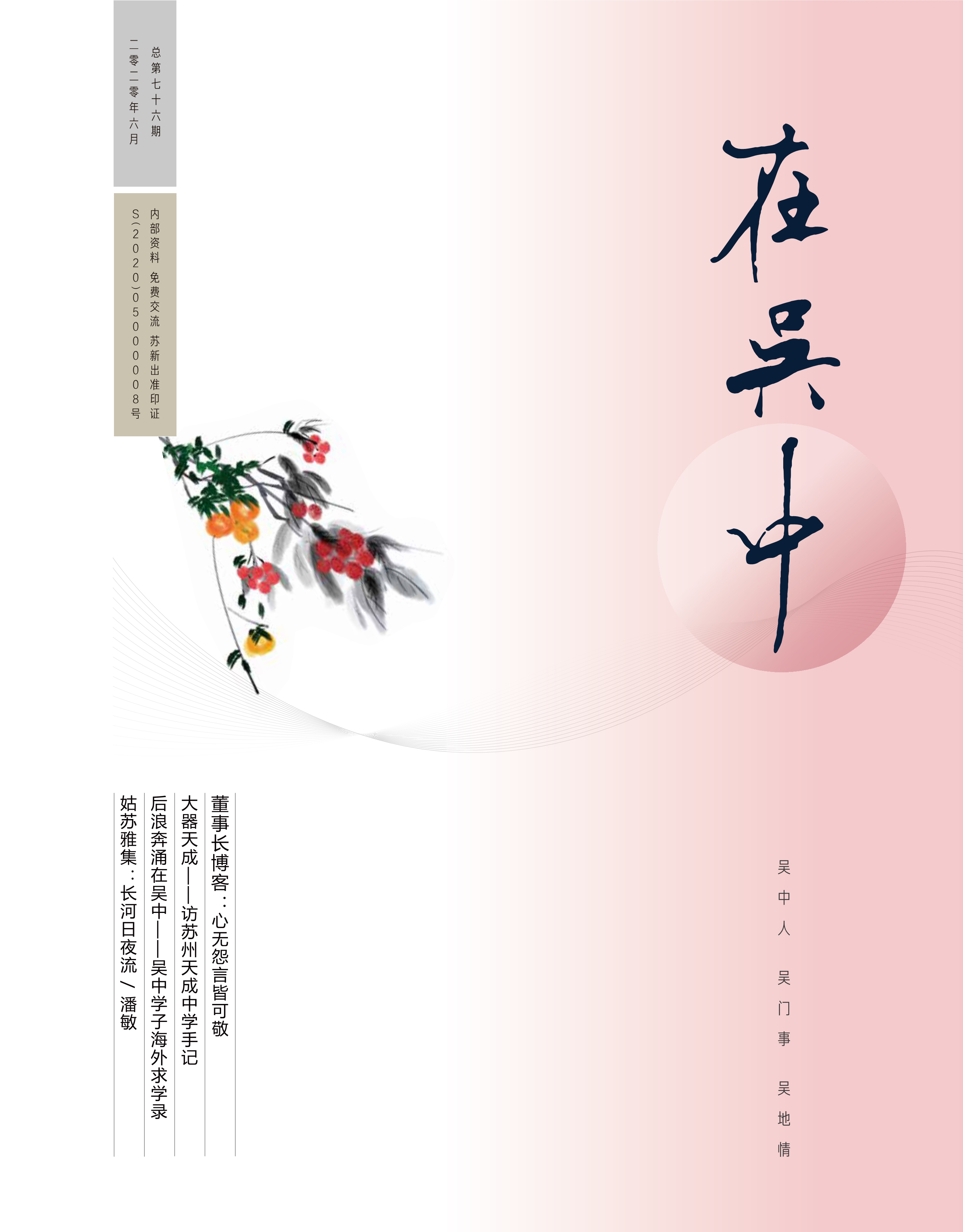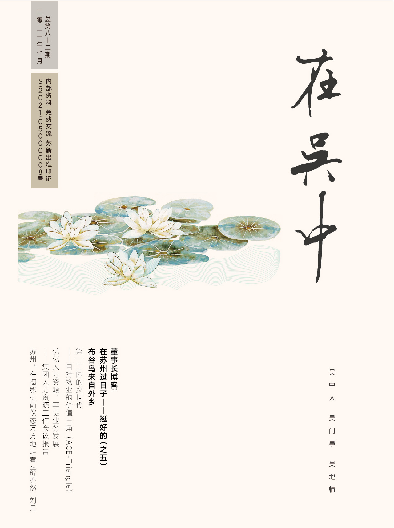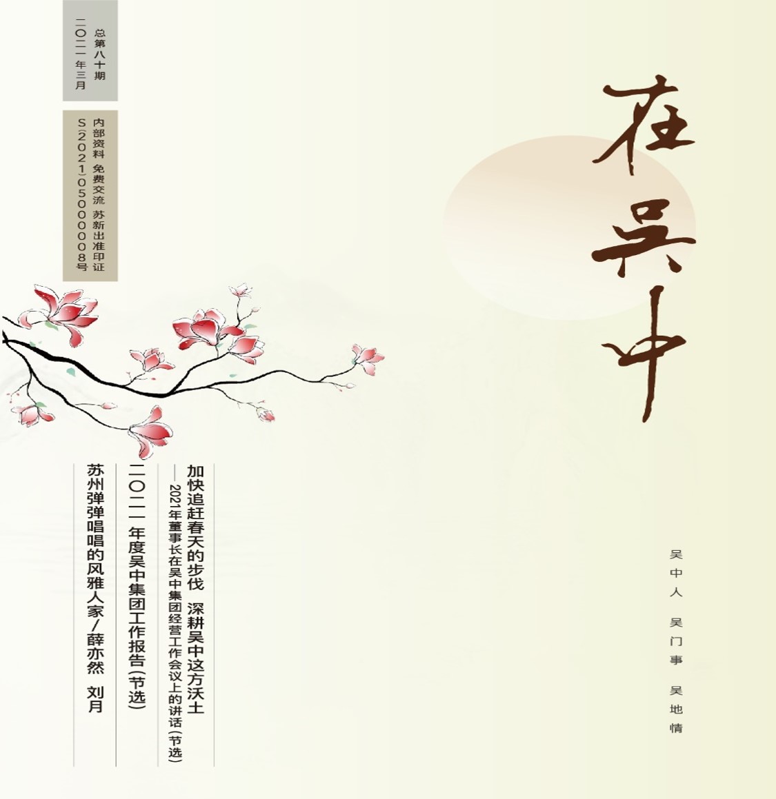 《在吳中》創(chuàng)刊于2005年,蘇州市十佳內(nèi)刊。以述吳中人、記吳中事、傳吳中情為宗旨,堅(jiān)持記錄吳中集團(tuán)的發(fā)展,為品牌建設(shè)發(fā)展助力?!对趨侵小穯纹谟∷?500冊(cè),主要用以企業(yè)內(nèi)部交流,其意在傳達(dá)的吳中集團(tuán)的力量、文化和精神。每期《在吳中》都記載著吳中人工作、學(xué)習(xí)、生活的實(shí)時(shí)動(dòng)態(tài),所見所聞、所思所想、所作所為,總結(jié)借鑒企業(yè)經(jīng)營管理之道,汲取吳地人文精髓,廣受社會(huì)各界的好評(píng)和認(rèn)可。